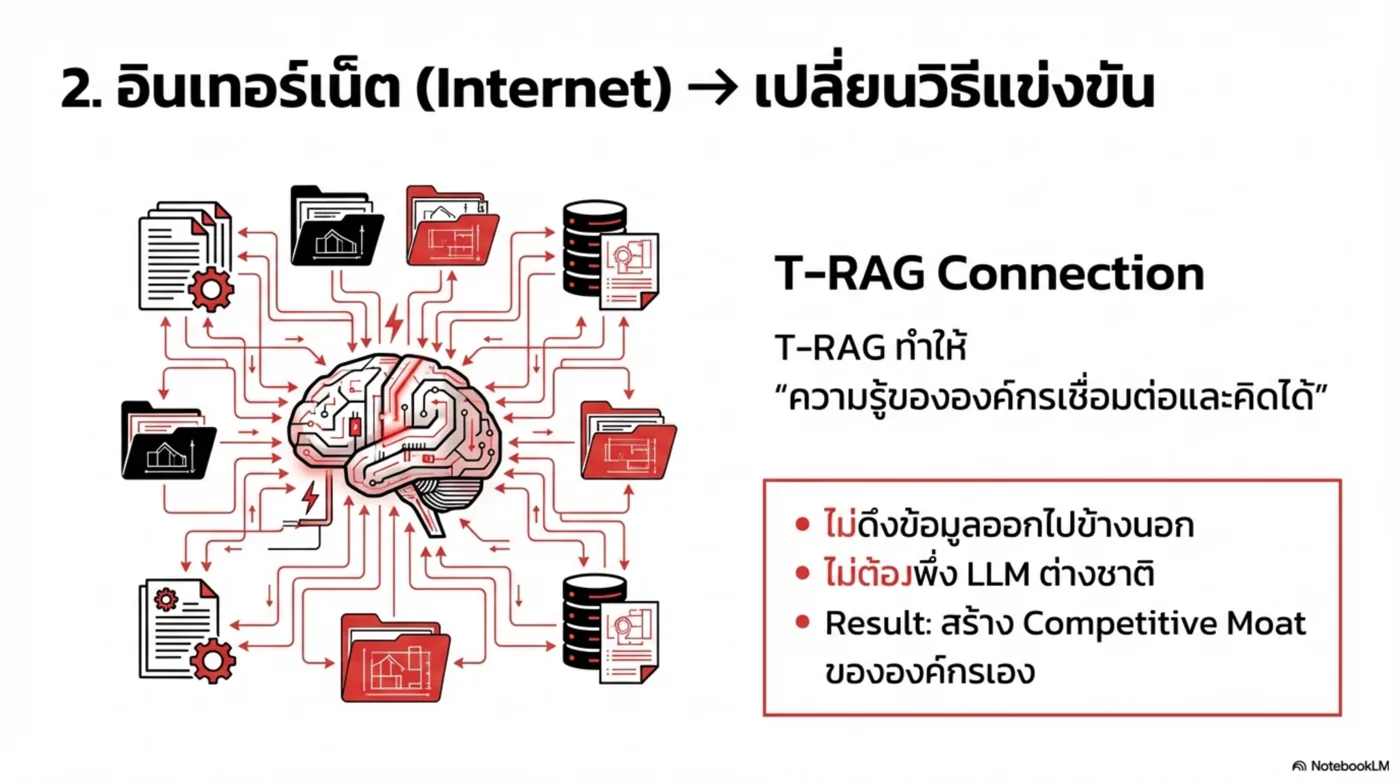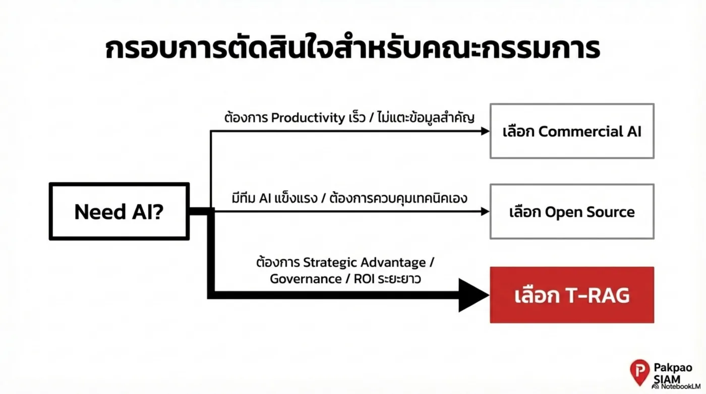 T-RAG Enterprise AI Infrastructure คือแพลตฟอร์มที่ทำให้องค์กร “เชื่อมความรู้–เข้าใจเอกสาร–ตัดสินใจได้” แบบองค์กรจริง: มี Governance, Auditability, และตัวเลือกติดตั้ง (On-Prem / Private Cloud / Cloud) ตามนโยบายข้อมูล
